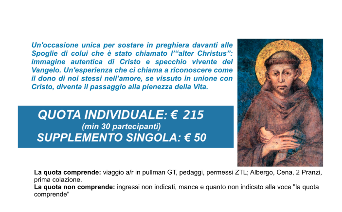 Per queste ragioni proponiamo a tutti, ed in particolare a chi ricopre ruoli di responsabilità (ma non solo), un paio di giorni di pellegrinaggio al corpo di San Francesco per domenica 15 e lunedì 16 marzo (alleghiamo il programma specifico).